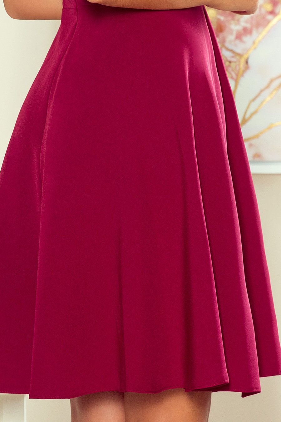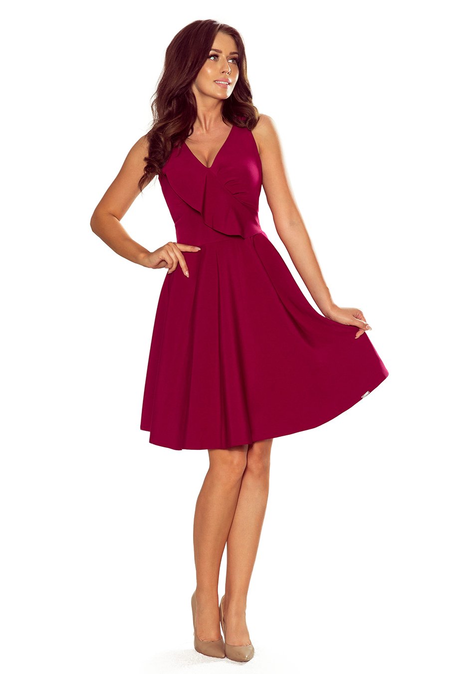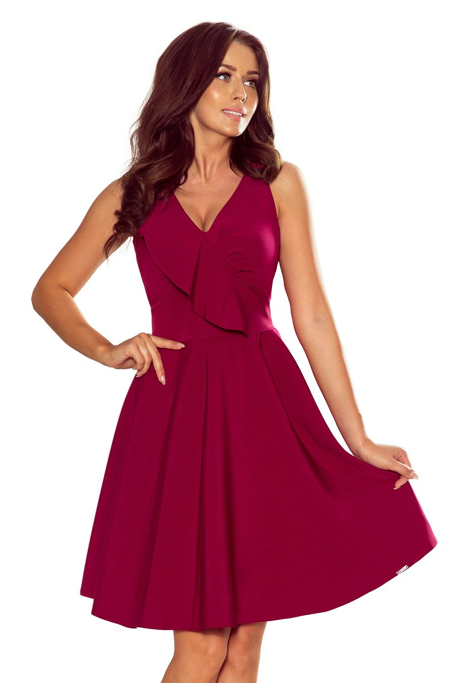 ANITA bordowa rozkloszowana sukienka z falbanką na dekolcie. Marka numoco. Produkcja polska.