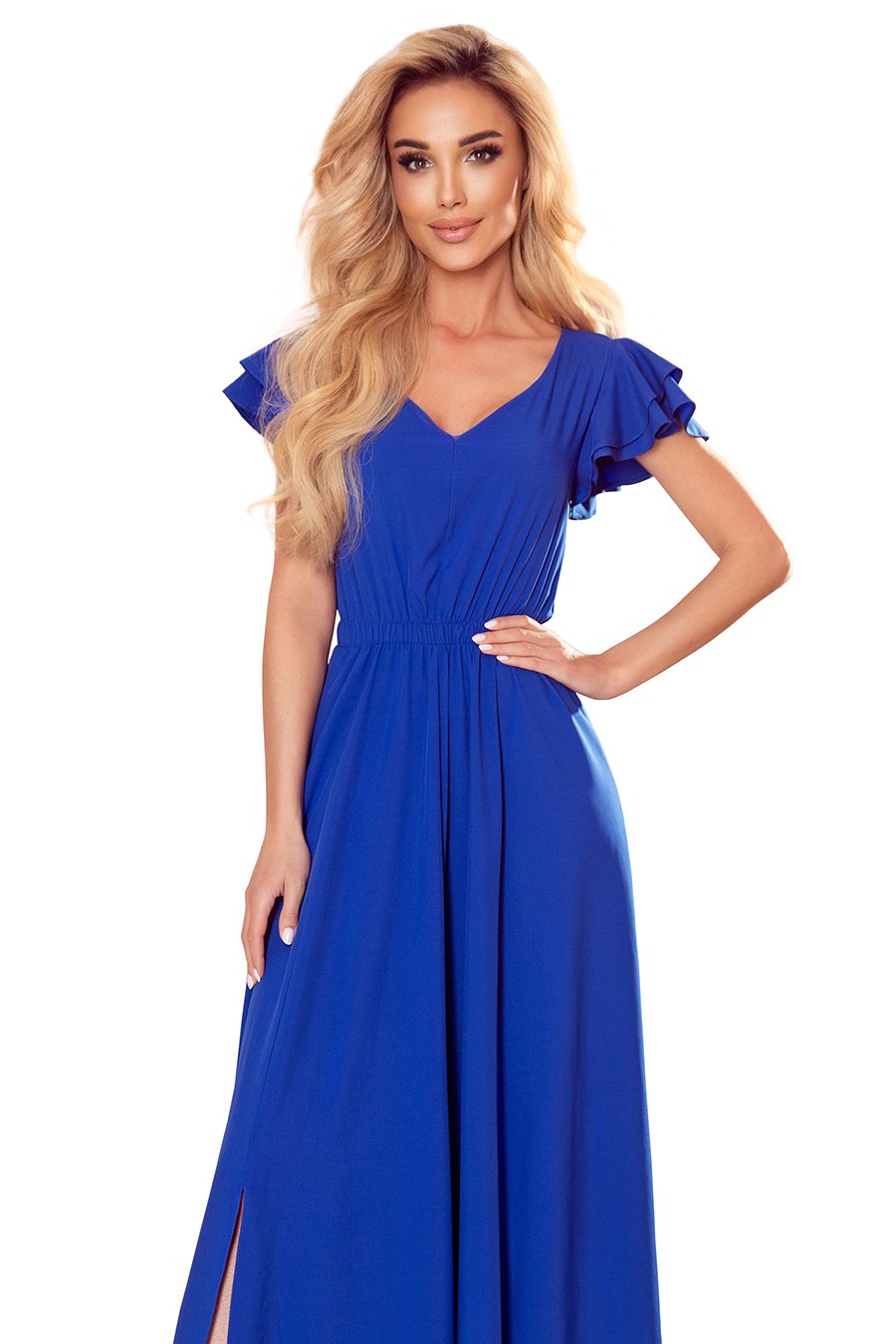 Lidia – długa sukienka z dekoltem i falbankami na ramionach. Kolor chabrowy. Marka numoco. Produkcja polska.