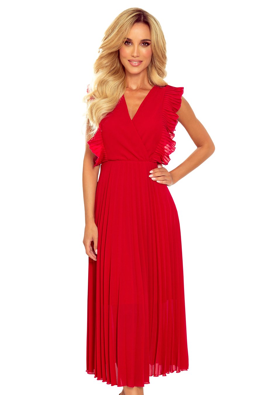 315-3 EMILY Plisowana sukienka z falbankami i dekoltem – CZERWONA