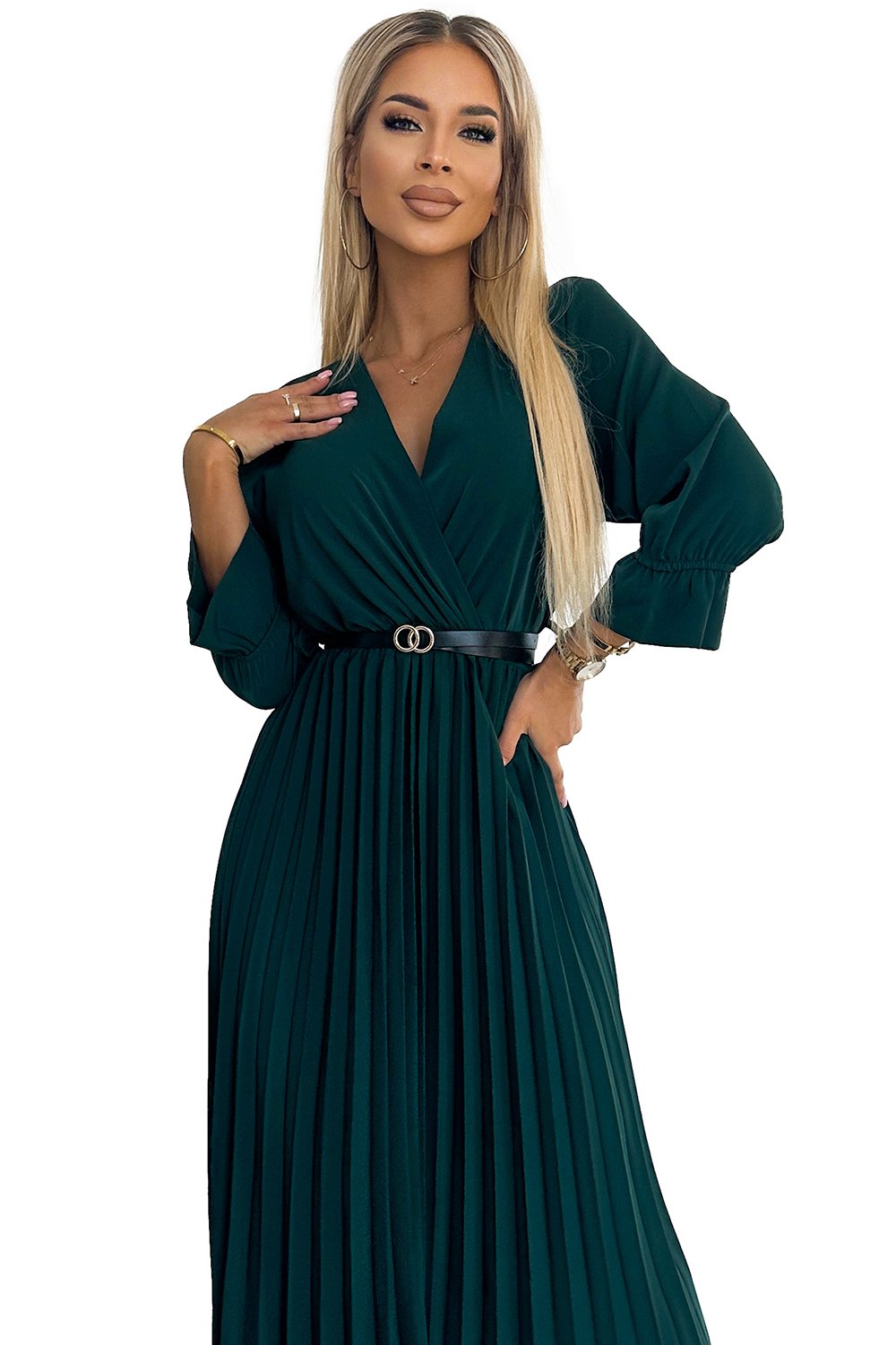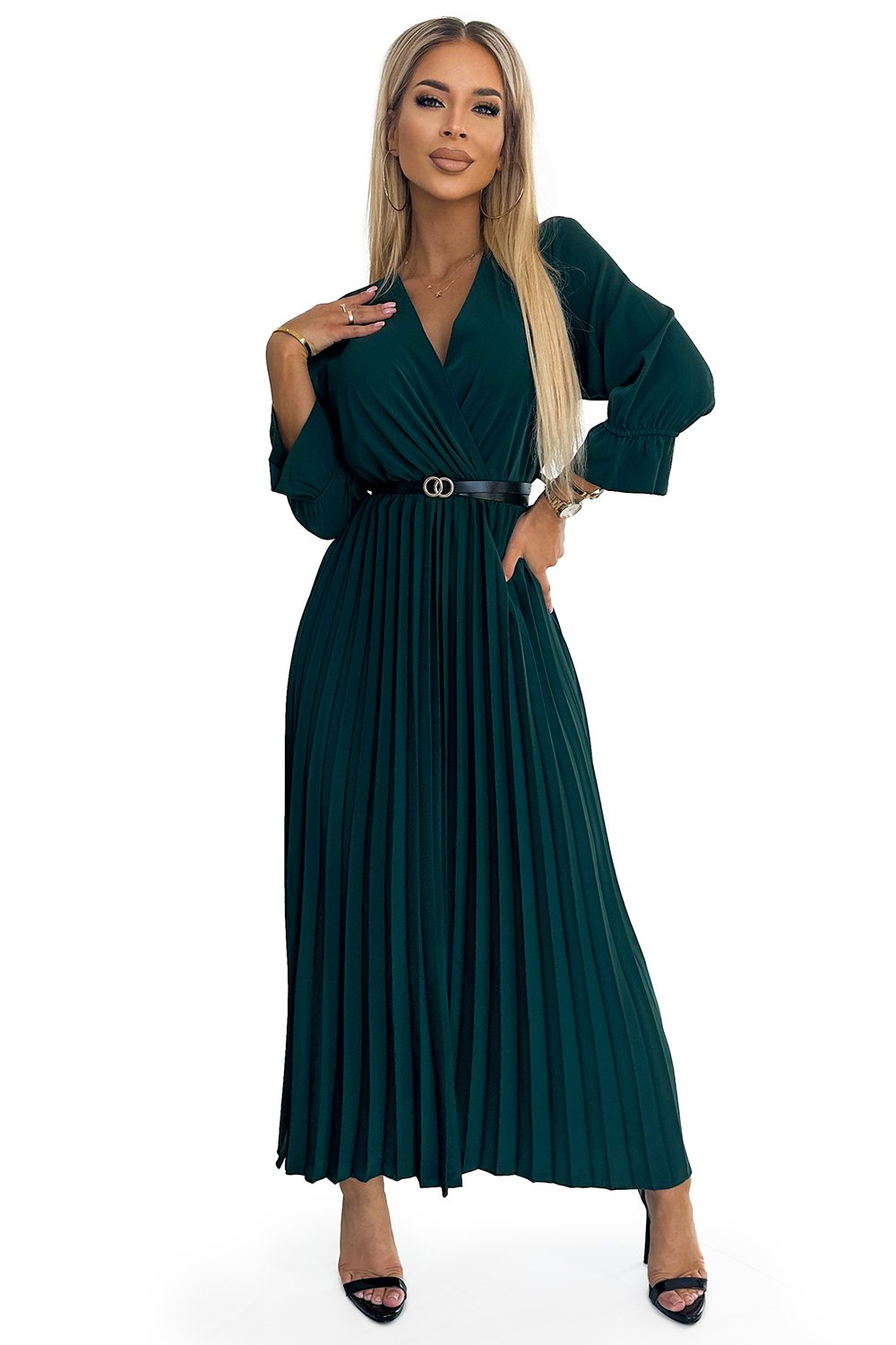 462-2 SERENA Plisowana sukienka maxi z dekoltem, paskiem i rękawem 3/4 – ZIELEŃ BUTELKOWA