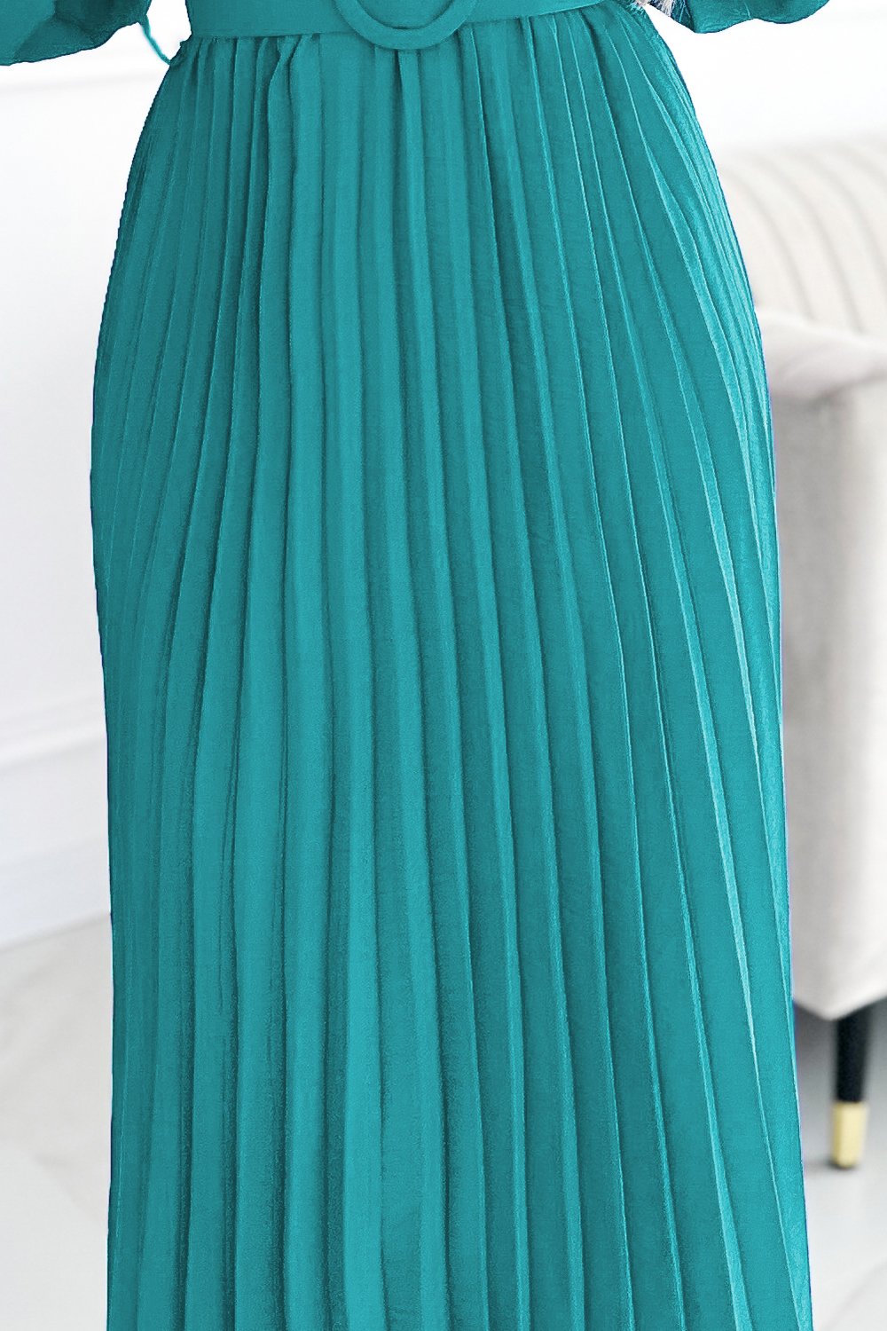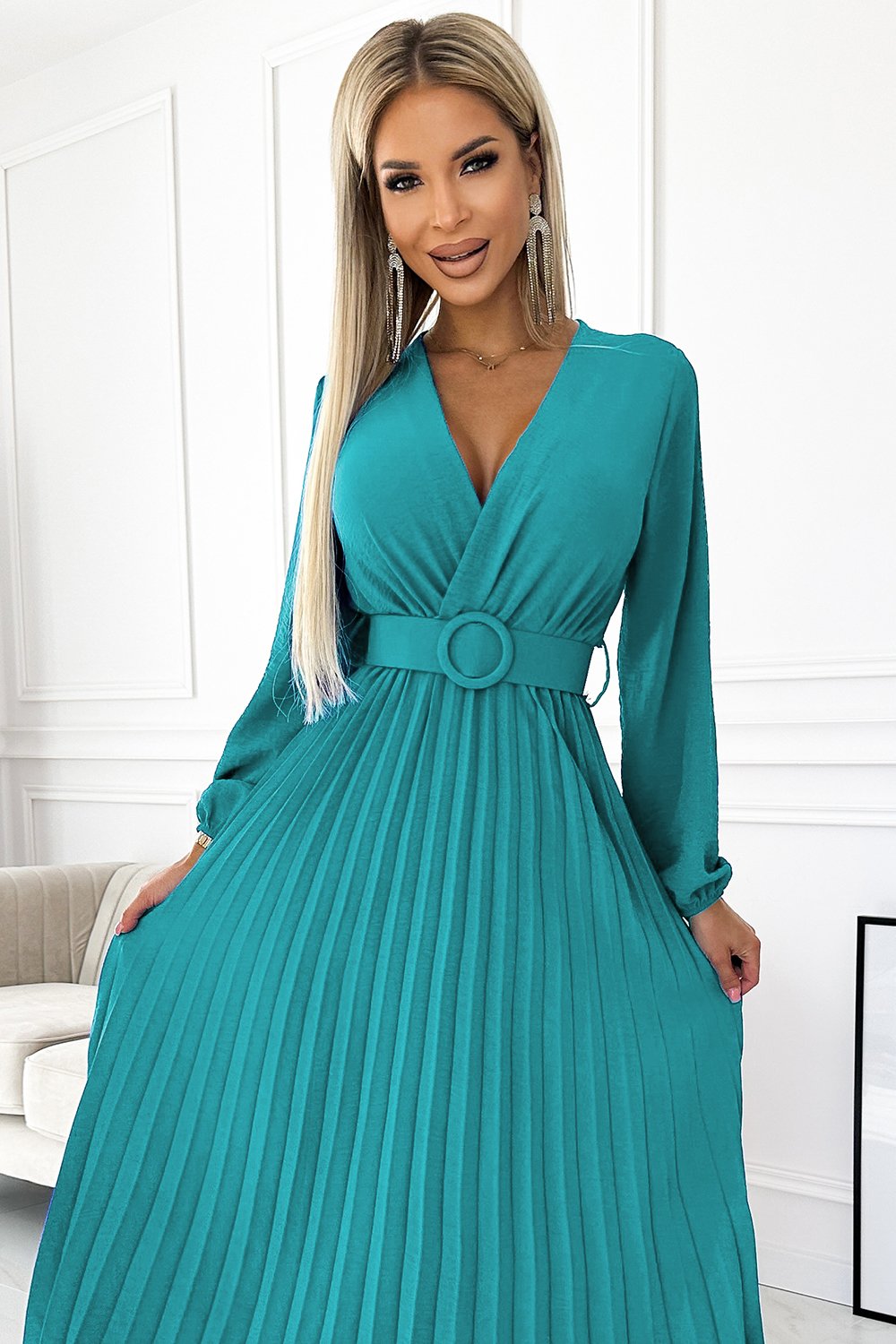 504-6 VIVIANA Plisowana sukienka midi z dekoltem, długim rękawkiem i szerokim paskiem – kolor MORSKI