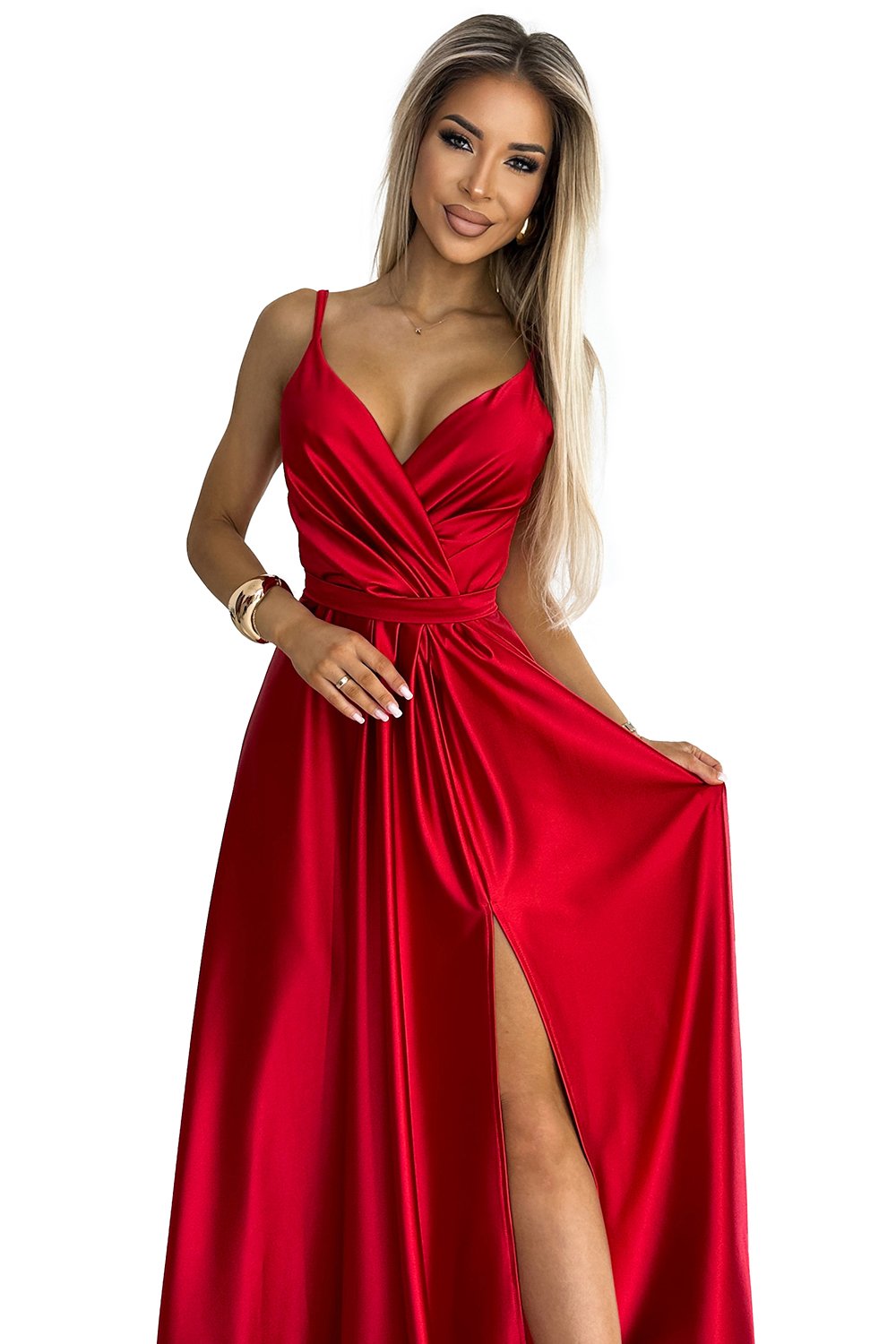 512-5 JULIET elegancka długa satynowa suknia z dekoltem i rozcięciem na nogę – CZERWONA