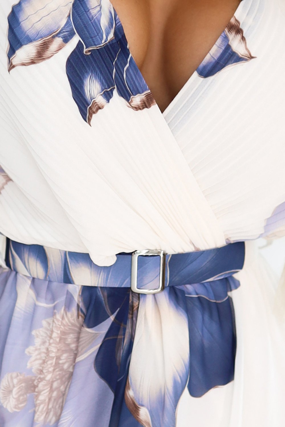 601-1 Zwiewna sukienka midi z kopertowym dekoltem i dużym kwiatowym wzorem – odcienie niebieskiego