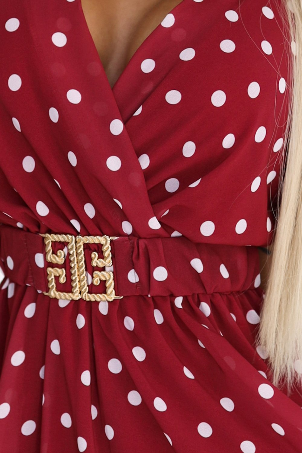 604-1 Zmysłowa sukienka w białe groszki z kopertowym dekoltem i ozdobnym paskiem – bordowa