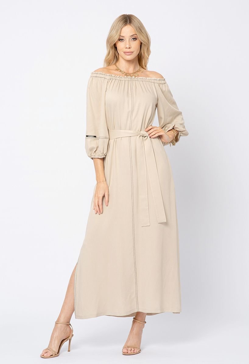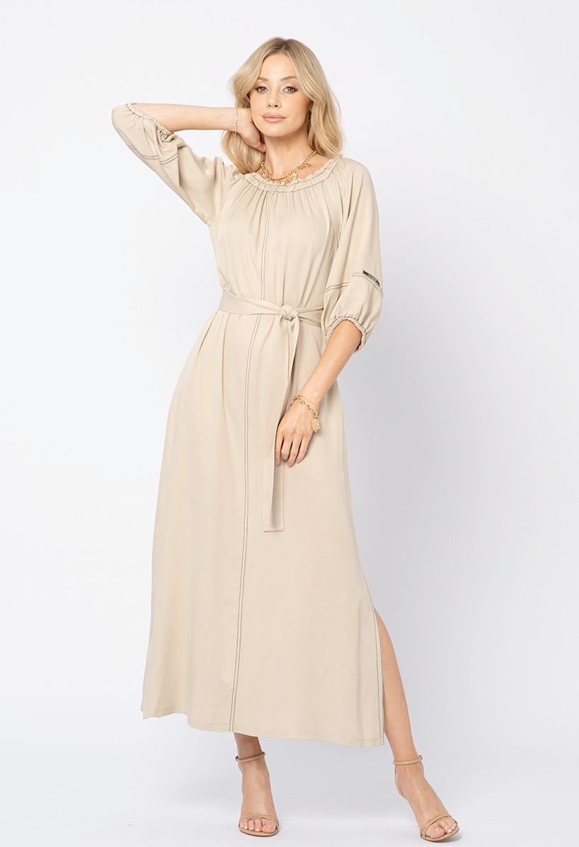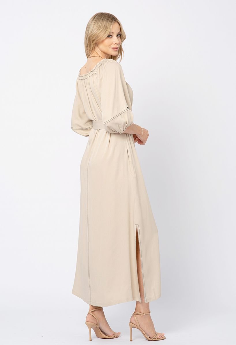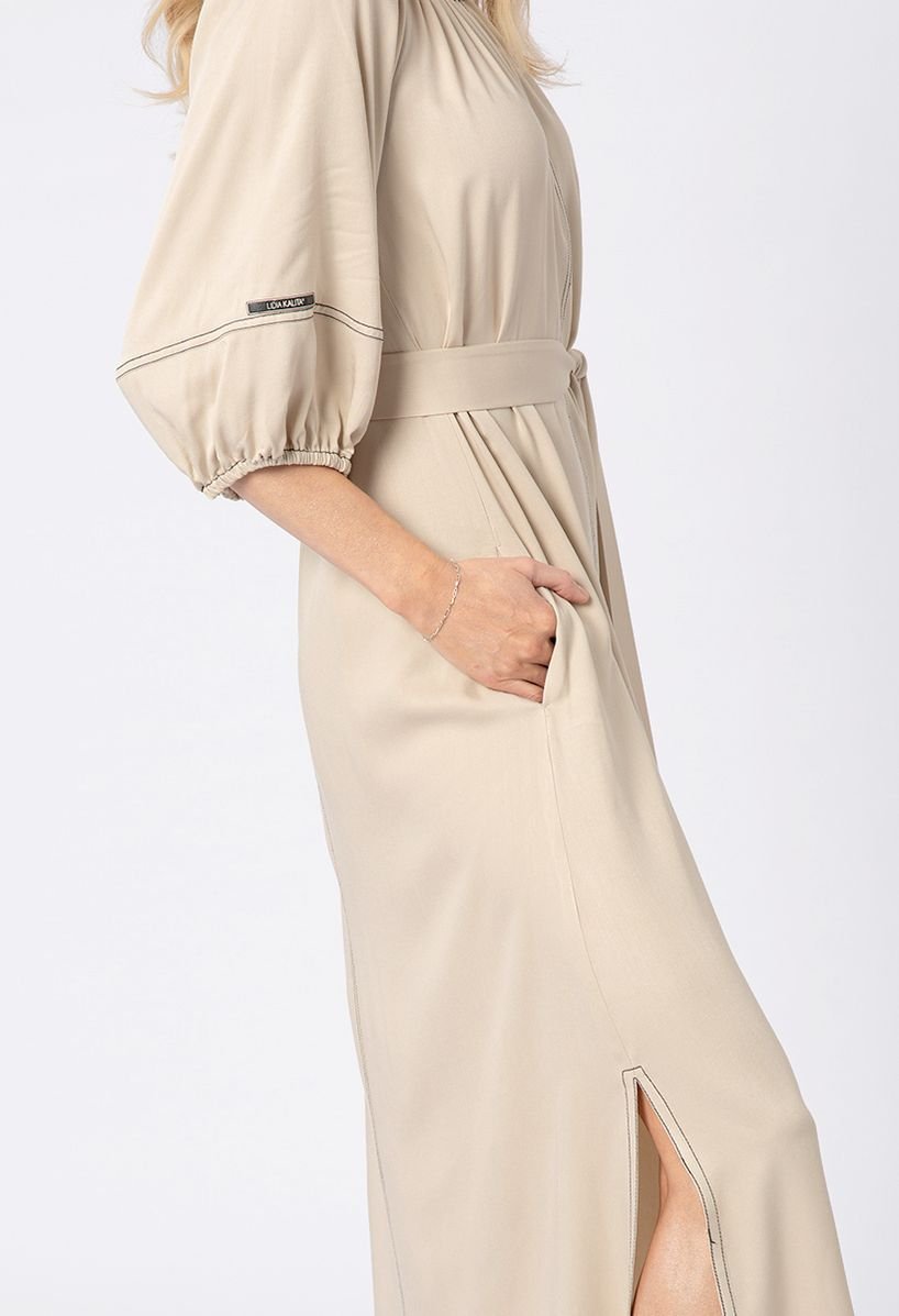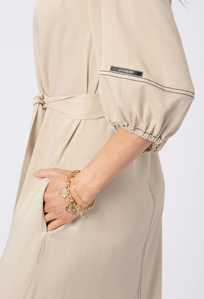 Beżowa sukienka z wiskozy z kontrastową nitką